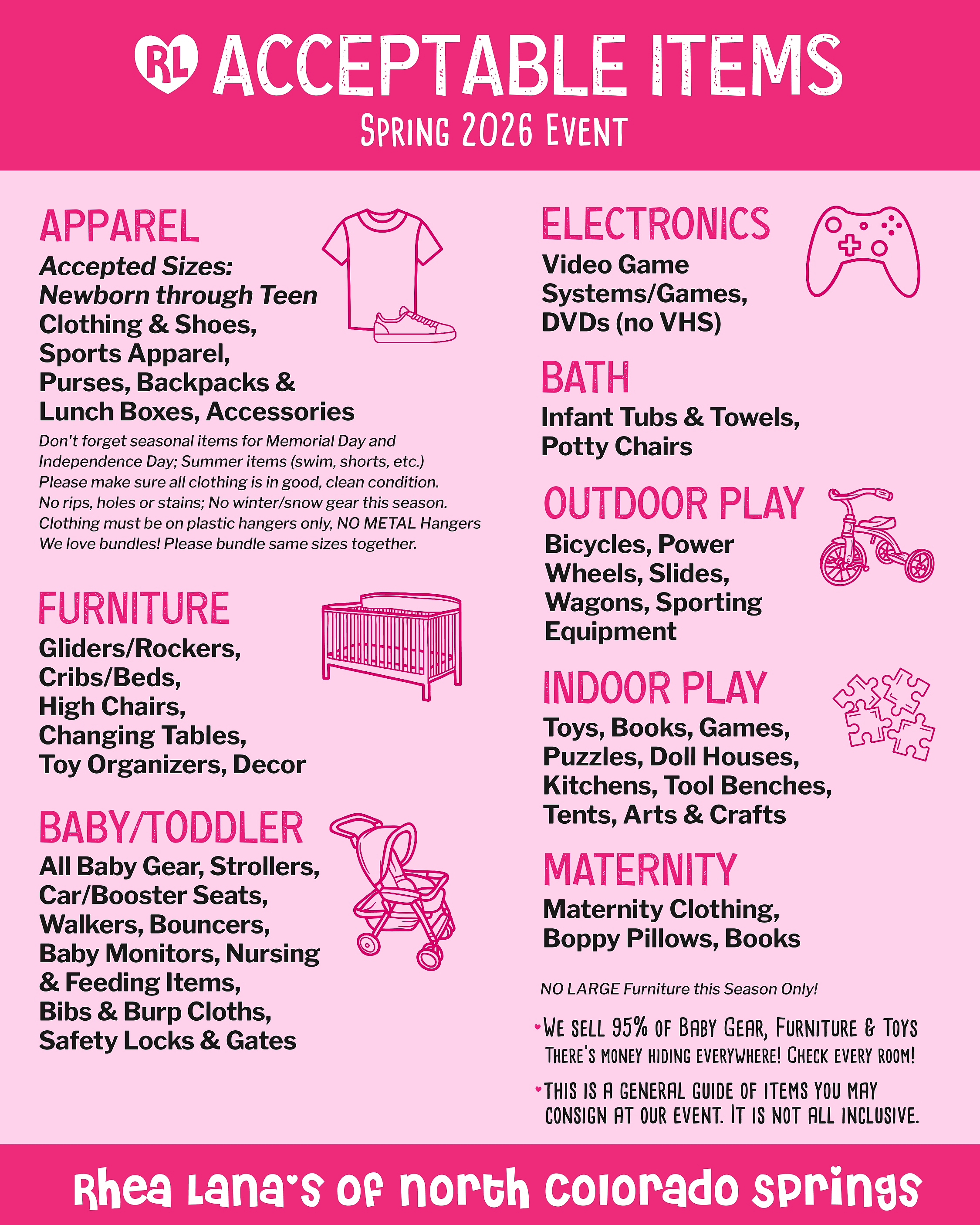Seasonal: For our Fall/Winter Event, we will not accept Memorial Day, Independence Day/Fourth of July, or Easter clothing.